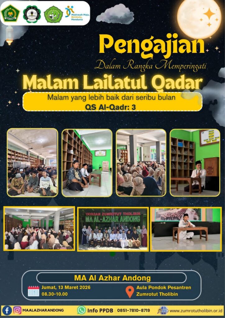 Pada Hari Jum’at, 13 Maret 2026 MA Al-Azhar Andong menyelenggarakan kegiatan Pesantren Kilat Ramadhan sekaligus Peringatan Nuzulul Qur’an yang diikuti oleh seluruh siswa, guru, dan karyawan. Kegiatan tersebut dilaksanakan di Aula Ponpes Zumrotut Tholibin dengan suasana yang penuh kekhusyukan dan kebersamaan.